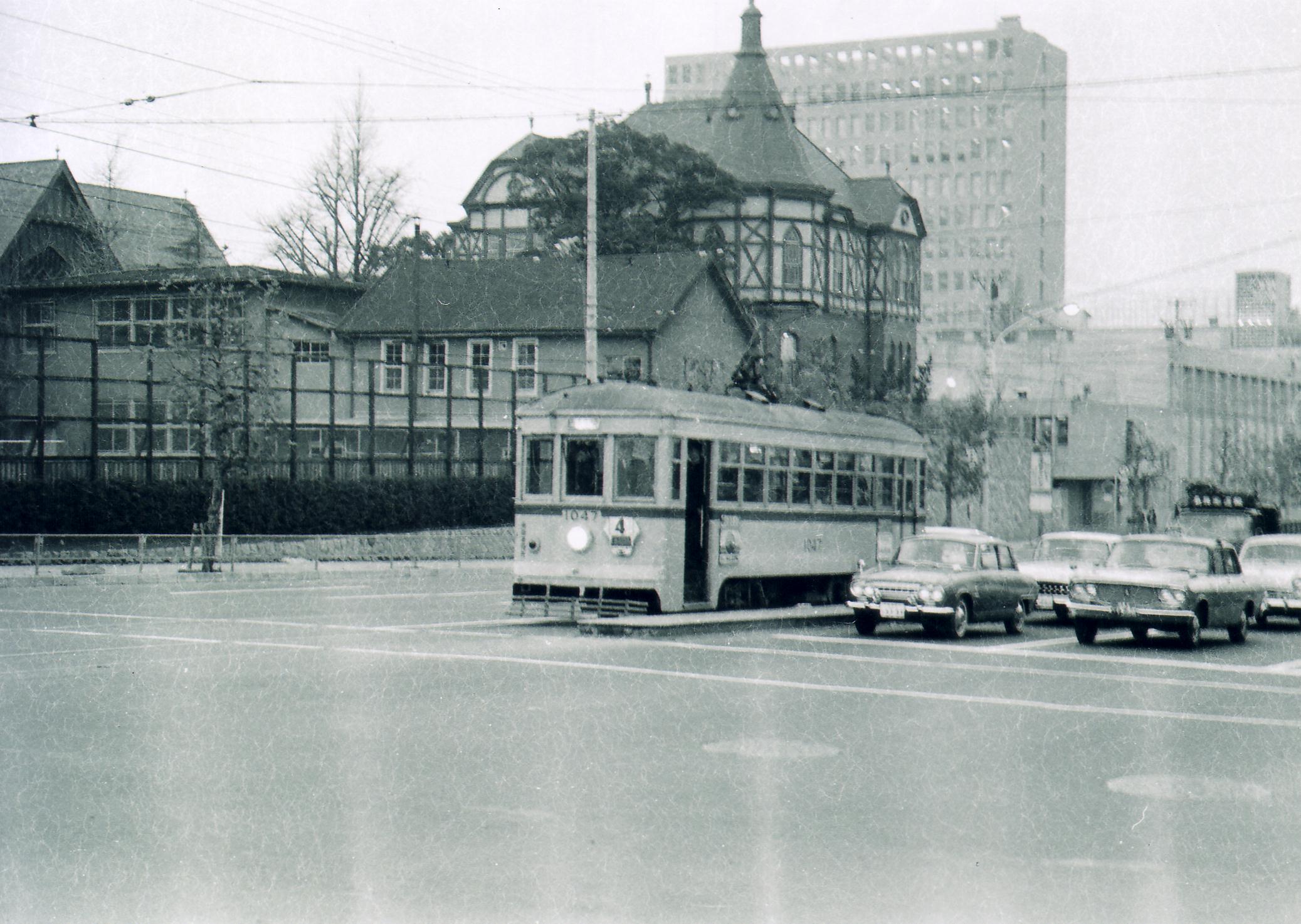 A Toden Line 4 streetcar (Gotanda to Ginza). Meiji Gakuin’s Memorial Hall, chapel, and Hepburn Building are in the background. I was to enter this university four months later…