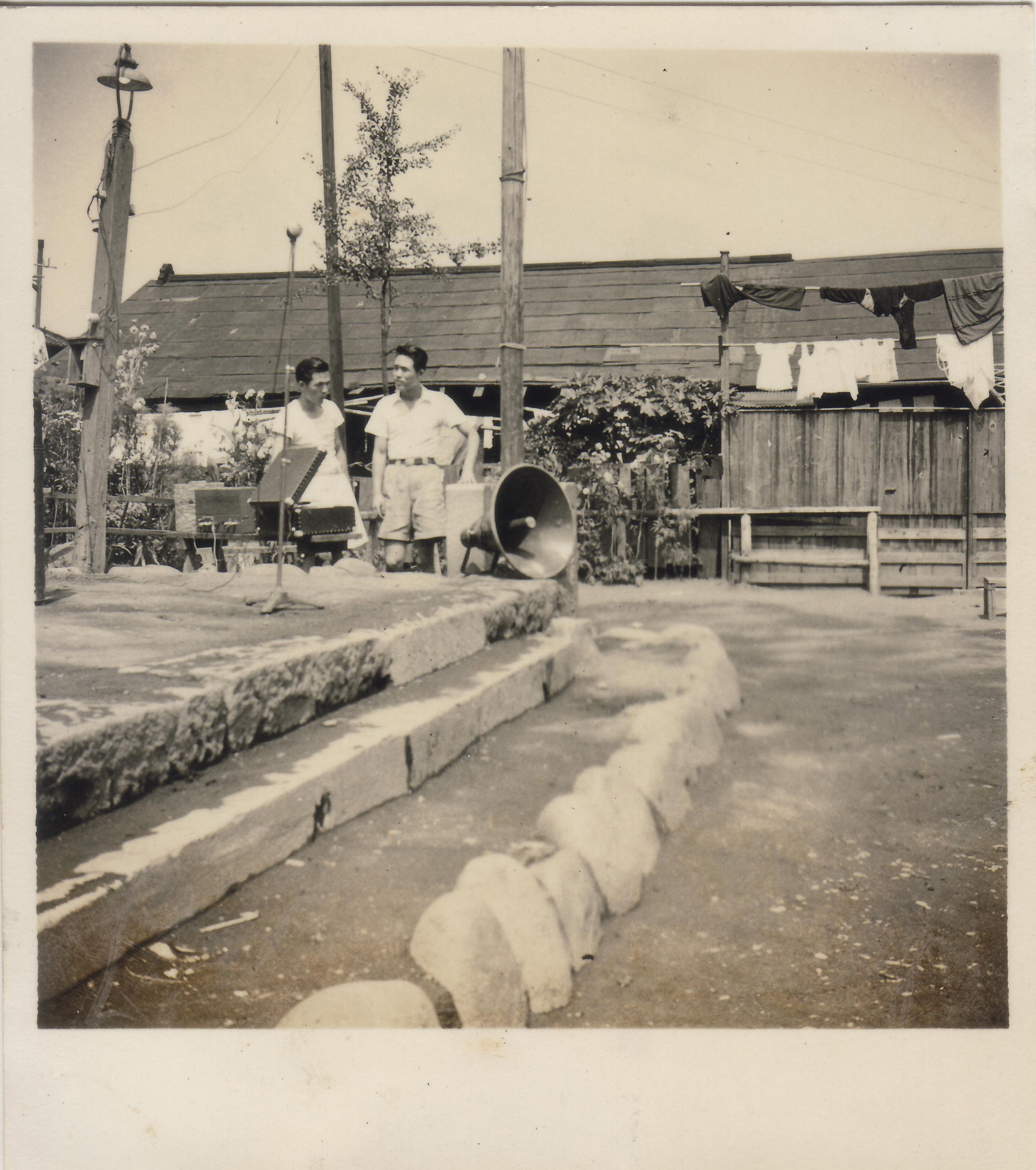 Getting ready for morning radio calisthenics. In the background is a one-story home with an iron roof. These homes became very noisy during evening showers.