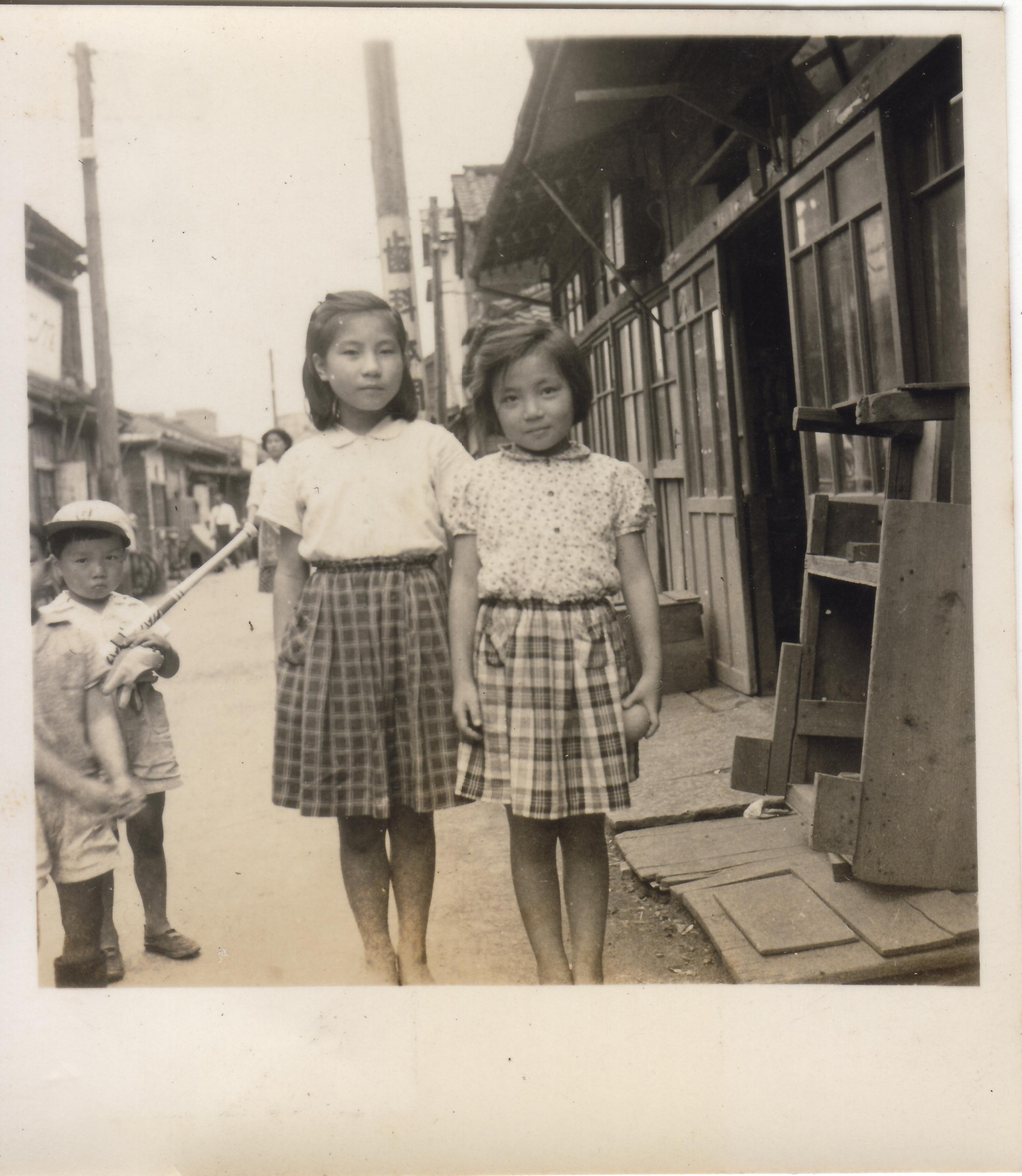 The photo shows a streetscape at the time and two sisters (in around their second or third year at elementary school). A streetscape of one-story houses can be seen in the background.