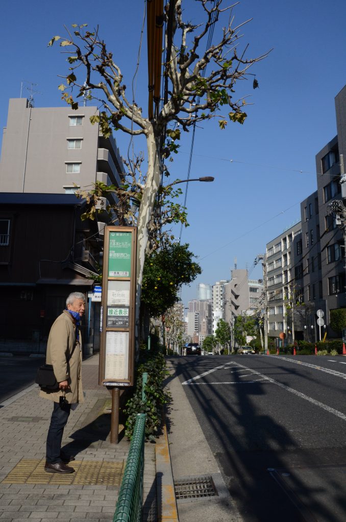 A photo showing the bus stop at Gyoranzaka-ue. Bus stops change in shape and form with the times, and records of them provide a valuable resource. It is also possible to detect the changes in the Gyoranzaka area based on people’s fashion, the state of the roads and the structure of the buildings.