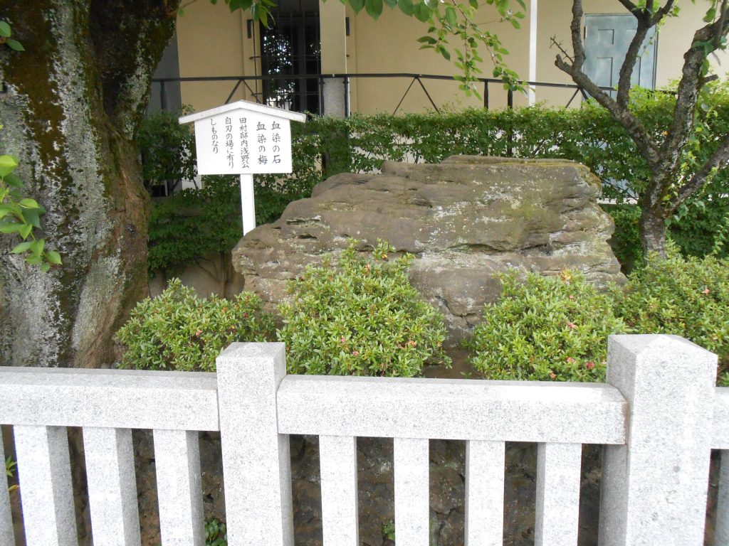 The stone is said to have been stained by the blood produced when Naganori Asano committed ‘seppuku’ (ritual suicide). It was moved here from Tamura Ukyo Dayu’s main Edo residence. There is a bloodstained plum tree beside it also.