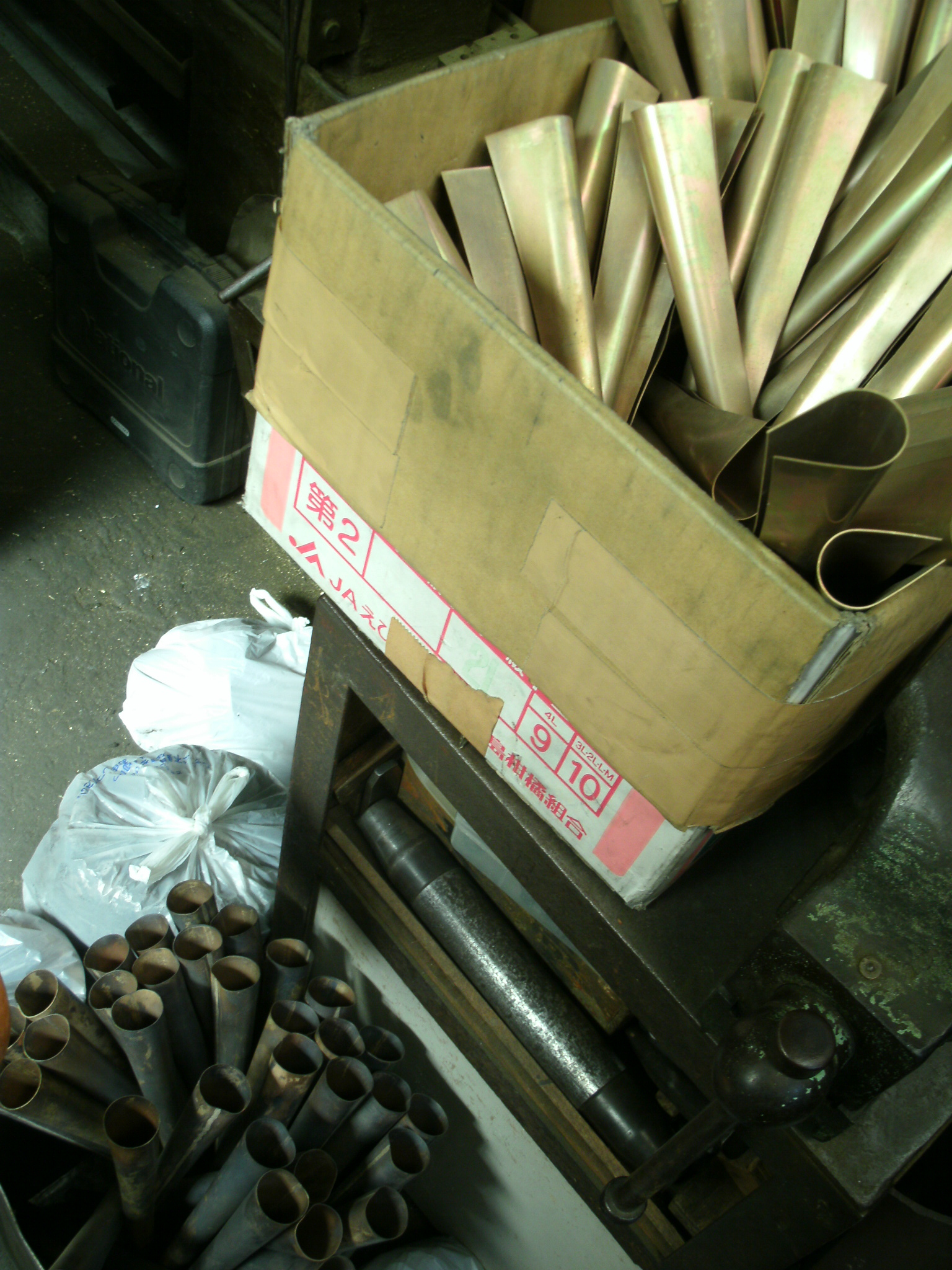 Manufacturing the unique bugles that are supplied to the Japan Self-Defence Forces. This photo shows the metal during the manufacturing process.