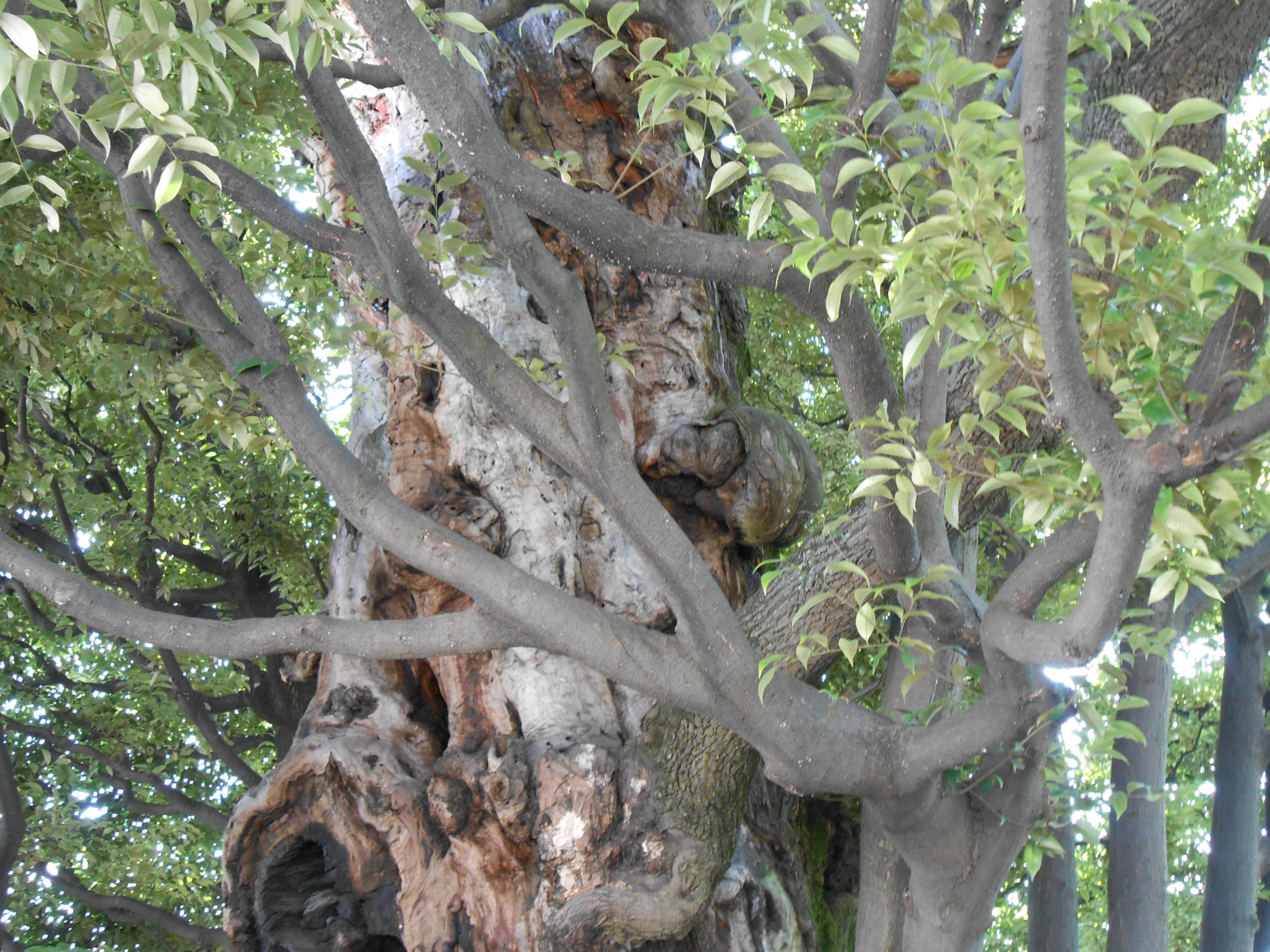 The unusual trunk of a beech tree, with a large cavity in the lower portion. The tree keeps watch over Takanawa.