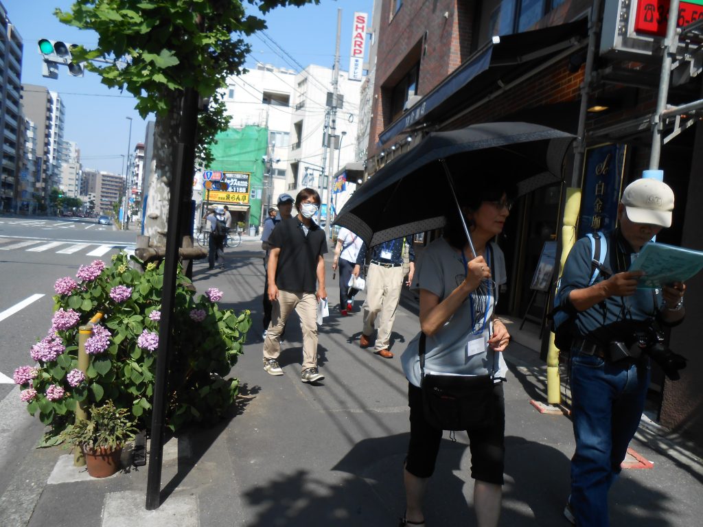 Some people use sun umbrellas, some wear masks. This was taken in June, when the weather is unstable. The hydrangeas already look set to wither up.