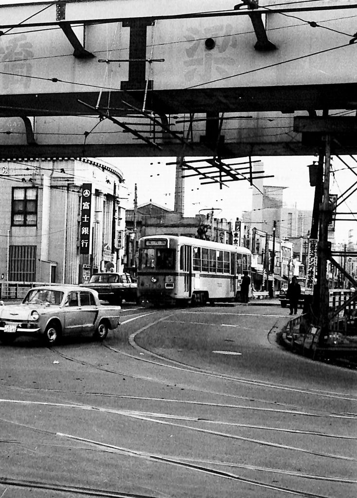 Line 5 bound for Eitai Bridge approaches Furukawa Bridge. Above the streetcar is the chimney of a public bath. To the left is the chic Fuji Bank building. The car in front is a Hino Contessa. Buildings are lined up in the back, showing the vitality of the area.
