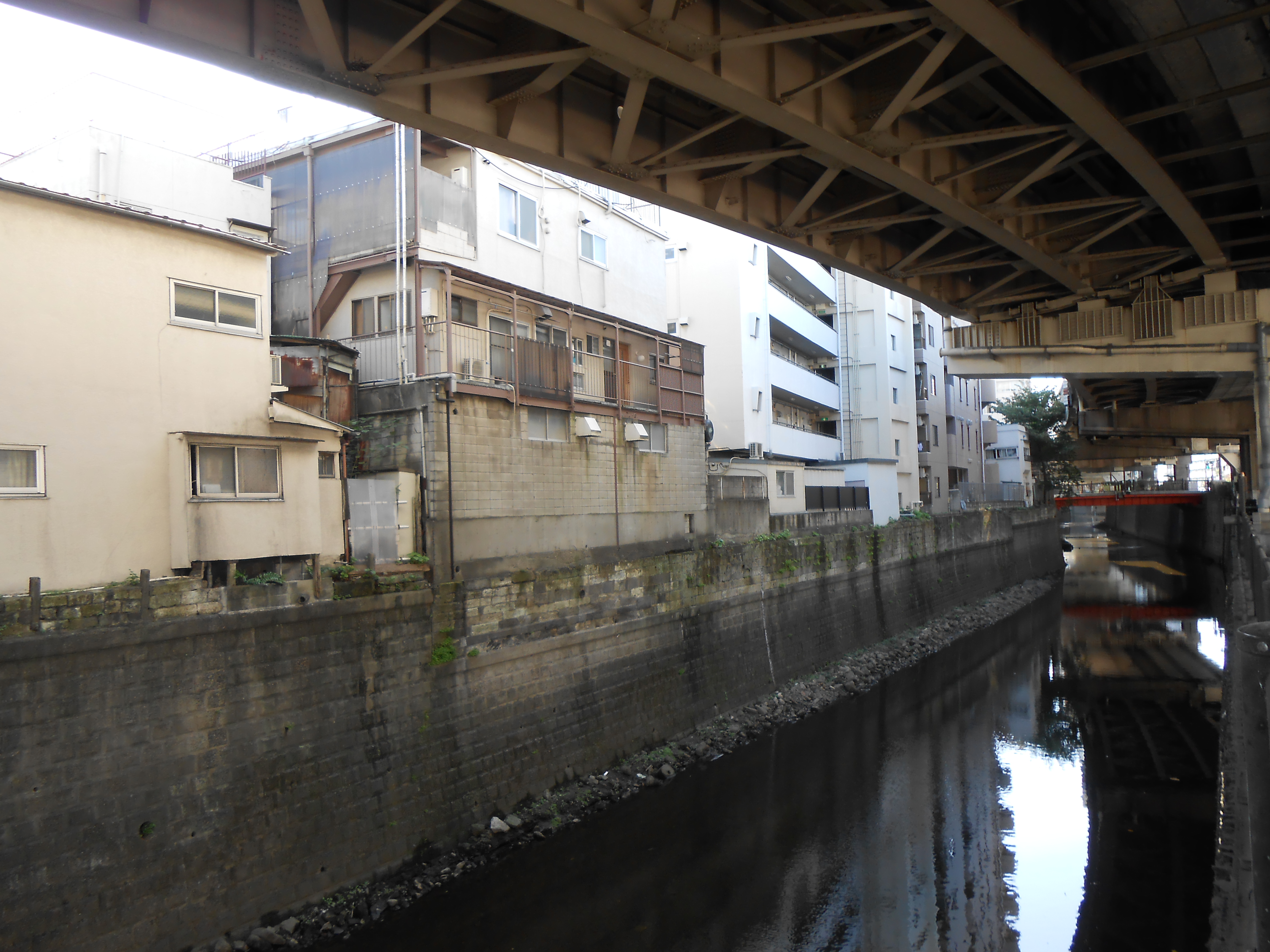 View of the riverbank, captured when turning back while walking from the Shinohashi bus stop to Furukawa Bridge. Old houses were built right on the edge. It was only recently that the water surface of Furukawa River became clean.