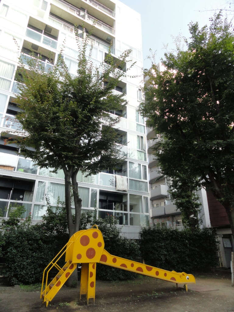 A playground surrounded by high-rise condominiums. In the city center, there are few places for children to play.