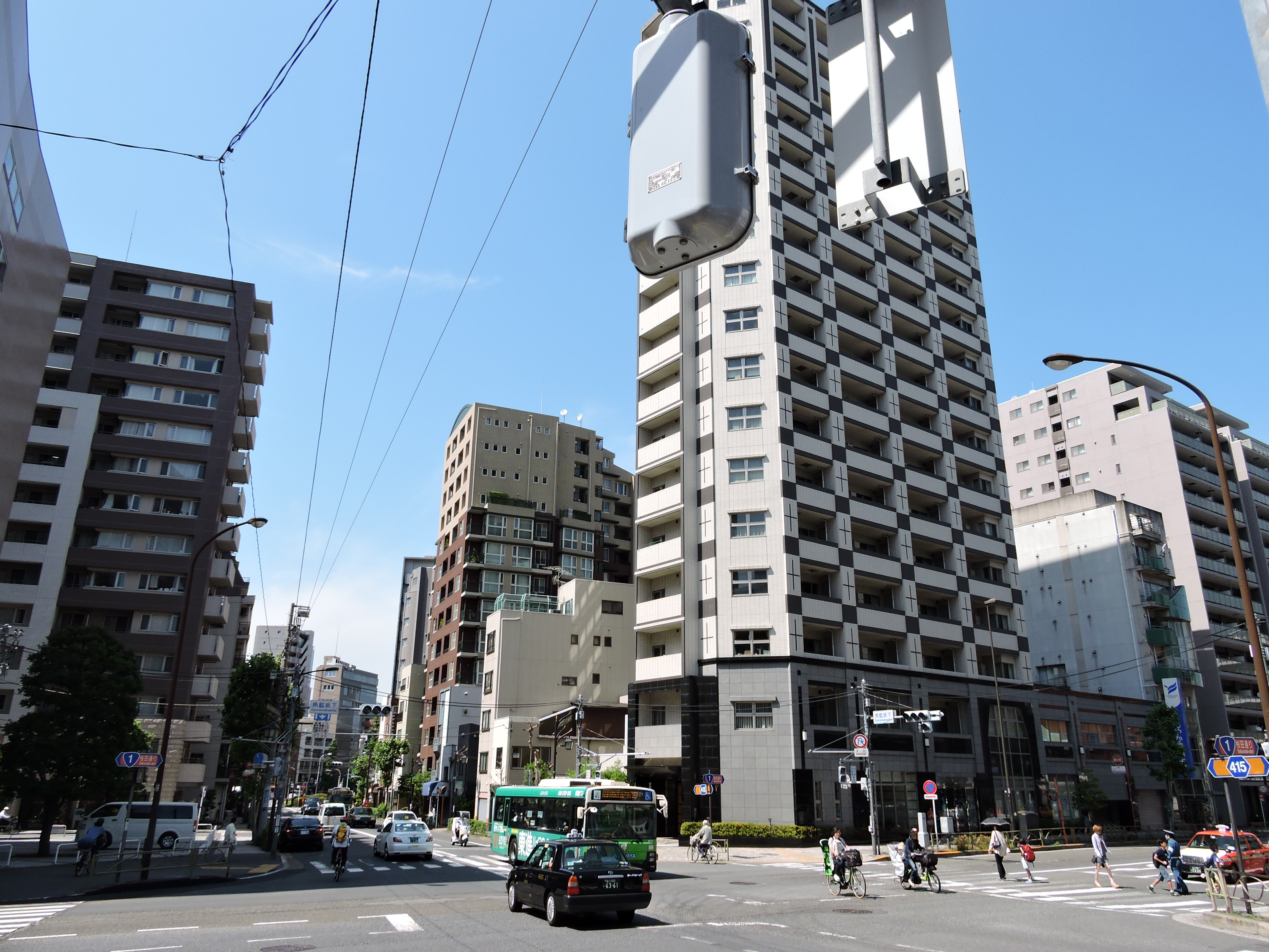 The intersection at Gyoranzaka-shita with its prominent and imposing 10-story office building completed in 1987.