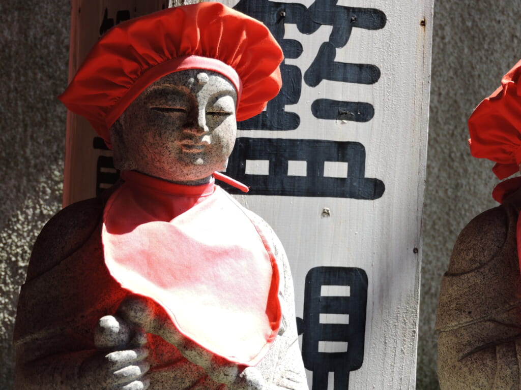 A beautifully smiling Jizo statue was basking in the spring sun, looking comfortable.