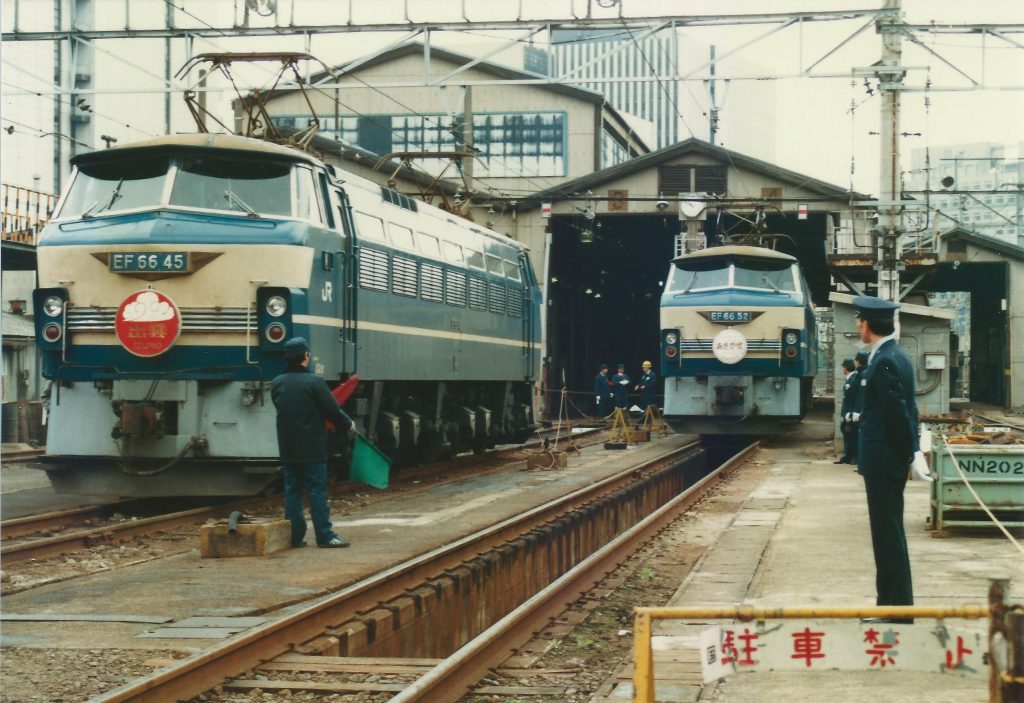 The engine depot was not usually a place opened to the public, but they said they'd show us, so I took my child to see it. In the left foreground was EF6645, the sleeper express "Izumo."