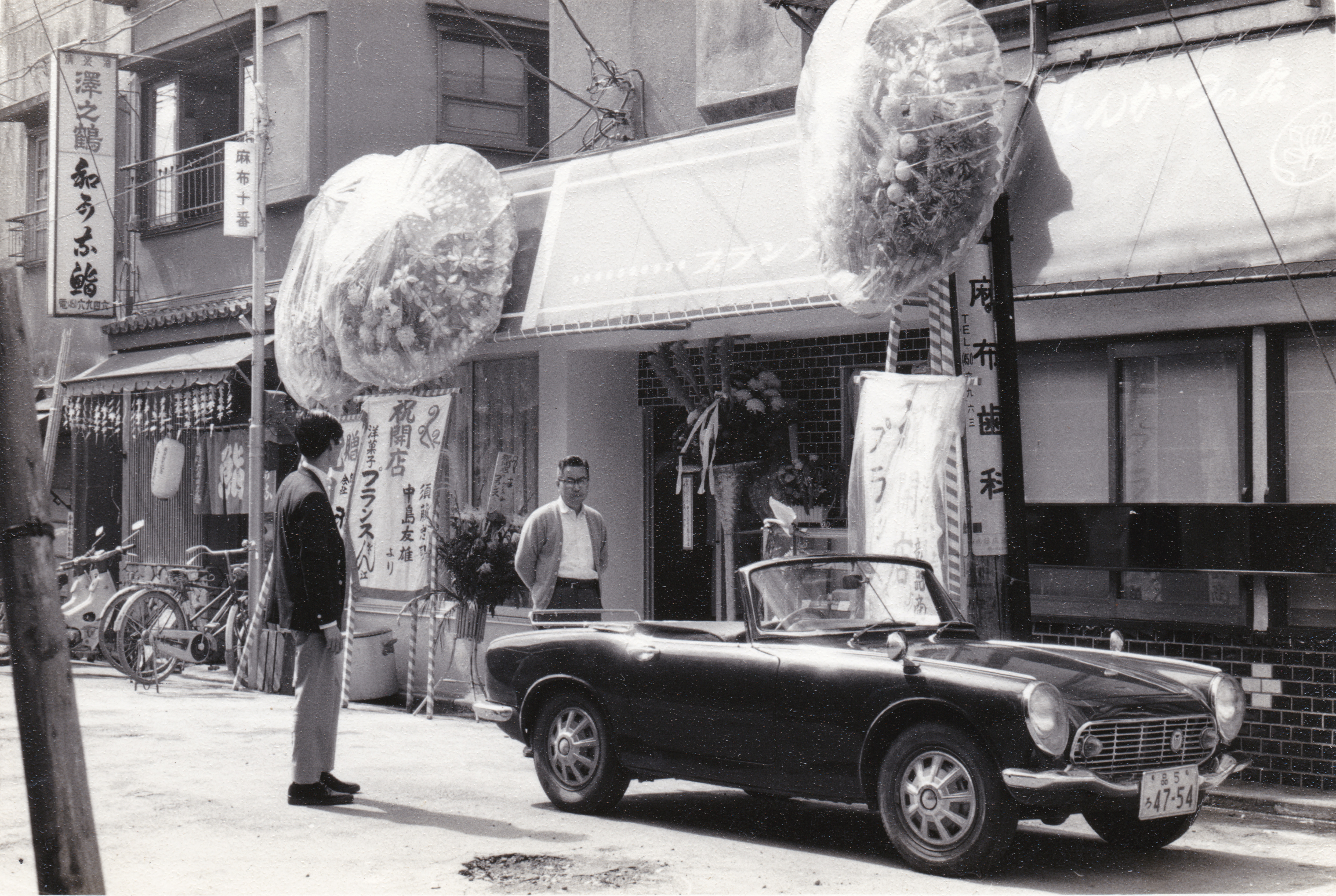 These are memories of opening my own shop independently at age 29. A cool car is parked alongside. The one in the middle is my father, and on the left is my brother, 9 years younger. Next door is a long-established sushi restaurant.