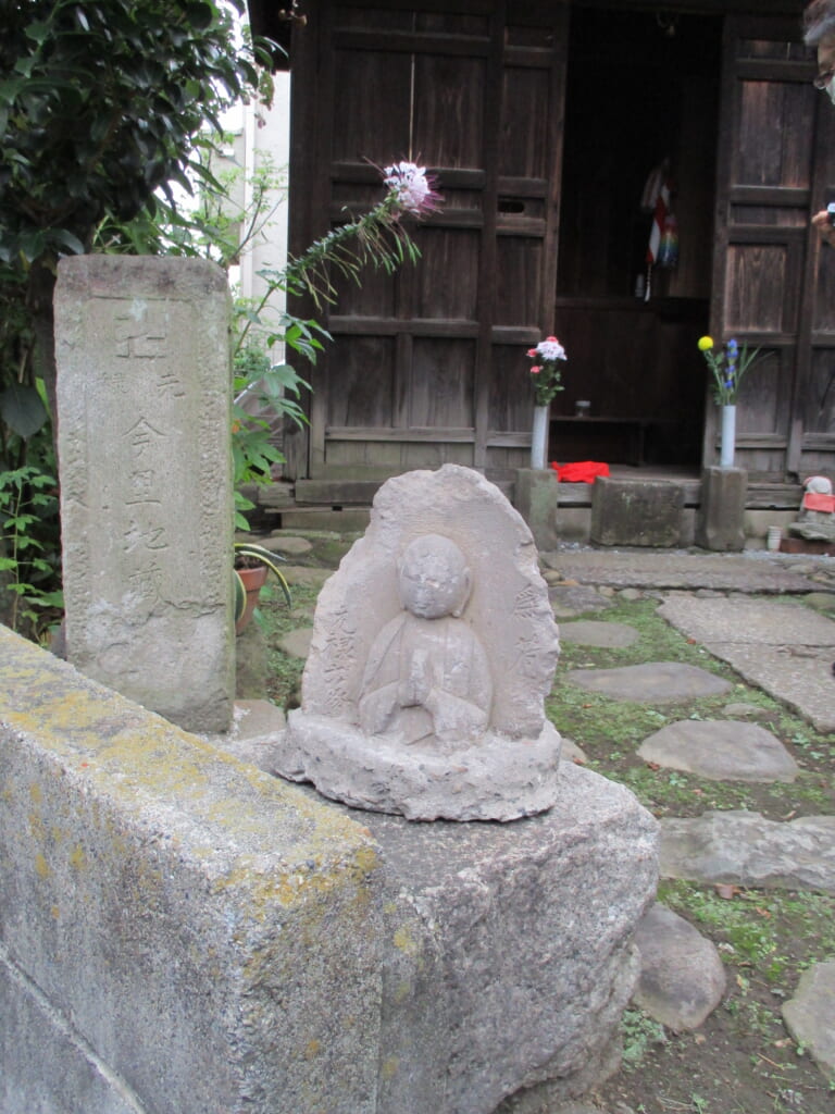 A small Jizo statue enshrined at the triangular junction of Minato City and Shinagawa Ward, watching over people passing by.